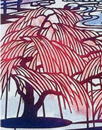 枝垂れ桜にある「なよやか」の形容には収まりきれない醍醐の枝垂れ桜、雲や風や水の流れを思わせる豪放ともいえる姿です。「醍醐花見図屏風」に見る桜は枝垂れではないので、その後に育てた「桜の宇宙」という方が適切かもしれません。 古来、日本人が桜によせる思いにはひときわ深いものがあります。昭和の初め、それは巧妙に軍事に利用されました。そしていま、「国を守る気概」の言葉を聞き「美しい国」と言われます。このとき「守る」のは何か、その方法は、「美しい」の内容は--? 同じ言葉を使いながら、全く違うことを意味していることのなんと多いことでしょう。美しい桜を見ながらそんなことを考えてしまうのは現代の不幸、まことになさけないことです。 三宝院の瓢箪と杯の苔庭と、流れの音が聞こえるような枝垂れ桜はよく似合います。なにものにもとらわれない自由闊達な想像力がこの取り合わせを生んだのでしょう。 (切り絵と文 川越 義夫)