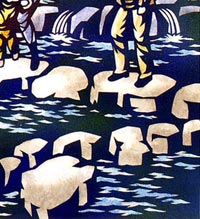 近鉄祝園駅からバスで約8分、豊かな田園であった相楽の丘陵が開発され新しい都市が作られています。その中の「けいはんな記念公園」を訪ねました。 公園はその昔灌漑に利用されていた永谷池を中心に周囲の林を生かして構成され、土地の歴史を伝えてくれます。優しい風と陽光は訪れる人を包み、微笑みの交歓が広がっています。また、ありがちな○○禁止の立札や有料遊具は見えずいい感じです。そんな空間に子どもは自由に遊びを見つけているようです。すぐに近くの男児が松ボックリを握らせてくれました。 政権交代で社会はこれまでと変わると思いたいのですが現実はそのままです。日本社会の多くの分野が市場原理主義競争社会となって喘いでいます。子どもの遊びは教育であり、教育の厚みは国民の生きる力です。子どもの遊びまでカネに換えてきたこの社会は、自殺増、人口減という社会として衰退の道を歩みはじめています。この危機的状況を救えるのは公共の場。自然を生かした公園は欠くことのできない大切な場です。集う人の表情を見て確信しました。 (切り絵と文・川越 義夫)