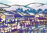 伏見のまちを訪れると、歴史は「身近な日々」であることを思わされます。鳥羽伏見の戦いの際の弾痕が残る家に、今日も人の営みが続いていたり、通りを歩くと水運で栄えた都市の構造が鮮明に見えてくるからです。また、今ひとつの水─良質の地下水が全国に名を知られた銘酒を生み続けています。 豊臣秀吉の時代、伏見城の築城に伴って軍事・経済の見地から日本最大の河港がこの地に作られました。江戸時代に入ると、角倉了以の高瀬川開削を機に伏見は水運河港都市としてさらに発展します。京─大坂を結んだ舟運は、人、物資、文化を伝え、繁栄をもたらしたと歴史は語ります。 絵は「都名所図絵」を参考にしたその昔の京橋のあたり、さまざまな人と舟の往来と、人間らしい交歓の場を再構成しました。現代の社会が失ったものを改めて考えさせられます。いま、復活した三十石舟が桜や柳を背景に流れを往復しています。 (切り絵と文 川越 義夫)