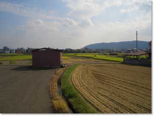 ▲今井用水が流れる長岡京市今里庄ノ渕の農地