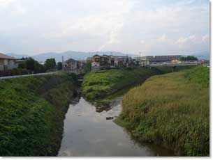 ▲住宅地(長岡京市西の京)に流れ込む今井用水