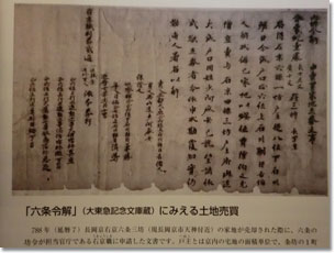 「六条令解 申賣買家地立券文事」で始まる"六条令解"(ろくじょうれいげ)という文書は、長岡京における土地売買を明らかにしています。"六条令解"には、長岡京右京六条三坊に住む正六位上石川朝臣吉備人(きびと)が家地(長さ十五丈、広十丈)を右京に住む御山造少阿麻女(みやまのみやつここあまめ)に銭5貫600文で売り渡す契約の成立と、官に届出て正式な証明書を作成する手続(立券)を求める旨の本文、保証人2名、延暦七年(788年)十一月十四日の日付が記載されています。解(げ)は下位の役所が上位の役所に提出する文書の形式であり、立券によって、購入地の所有権が国家に認証され、売買手続きが完了する制度であったようです。なお、長岡京の右京六条三坊は、現在の長岡京市八条ケ池の南部ないし長岡公園付近と思われます。